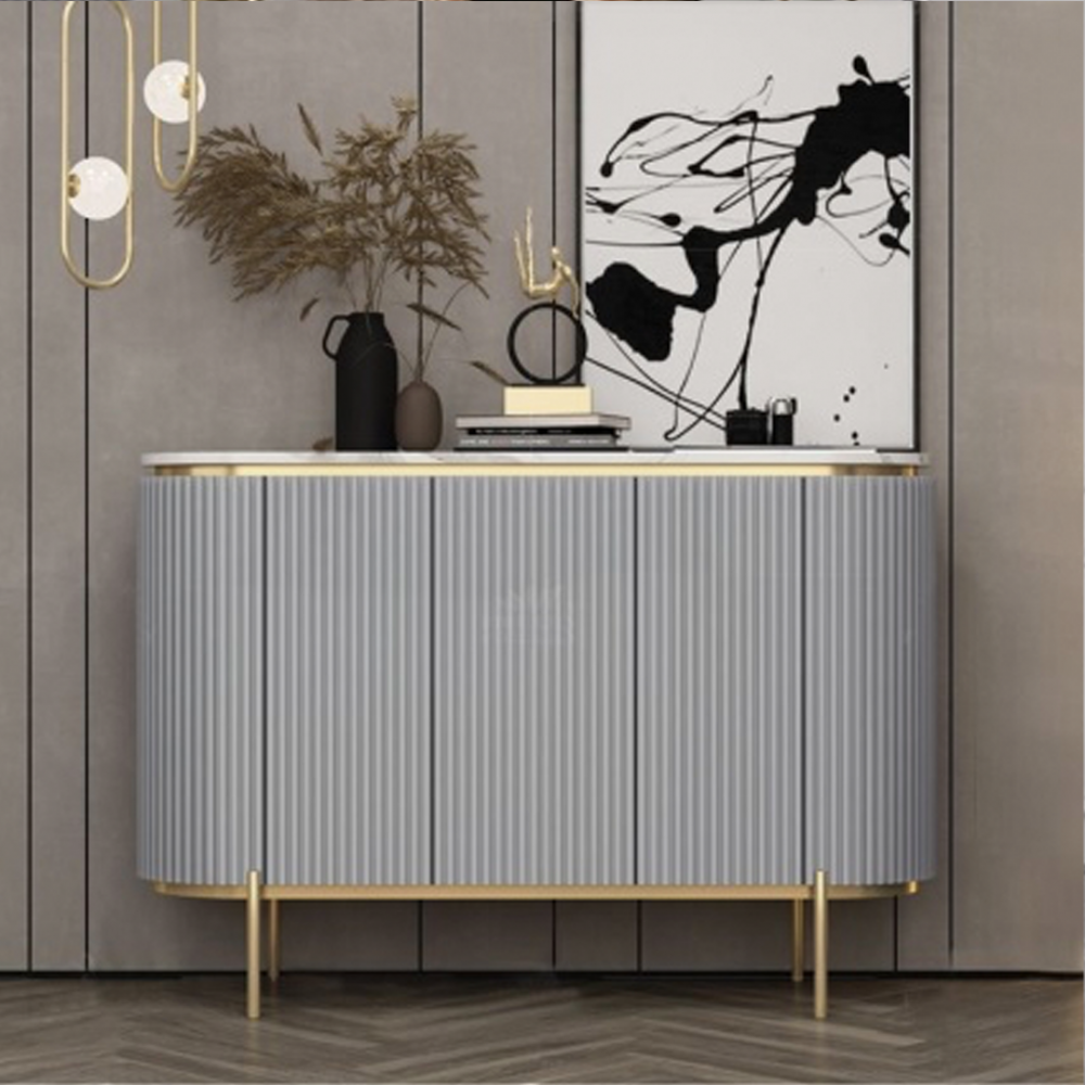 بوفيه مدخل أنيق باللون الرمادي، مزين بخطوط ذهبية مميزة تضيف لمسة من الفخامة. يأتي مع سطح أبيض لامع، مما يخلق تبايناً جذاباً ويعزز من جمالية التصميم.