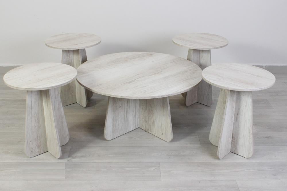 التصميم العصري واللون البيج يضفيان لمسة من الدفء والأناقة على أي مساحة. توفر الطاولات مساحة كافية لتقديم المشروبات والوجبات الخفيفة، مما يجعلها مثالية للتجمعات العائلية أو المناسبات الخاصة.