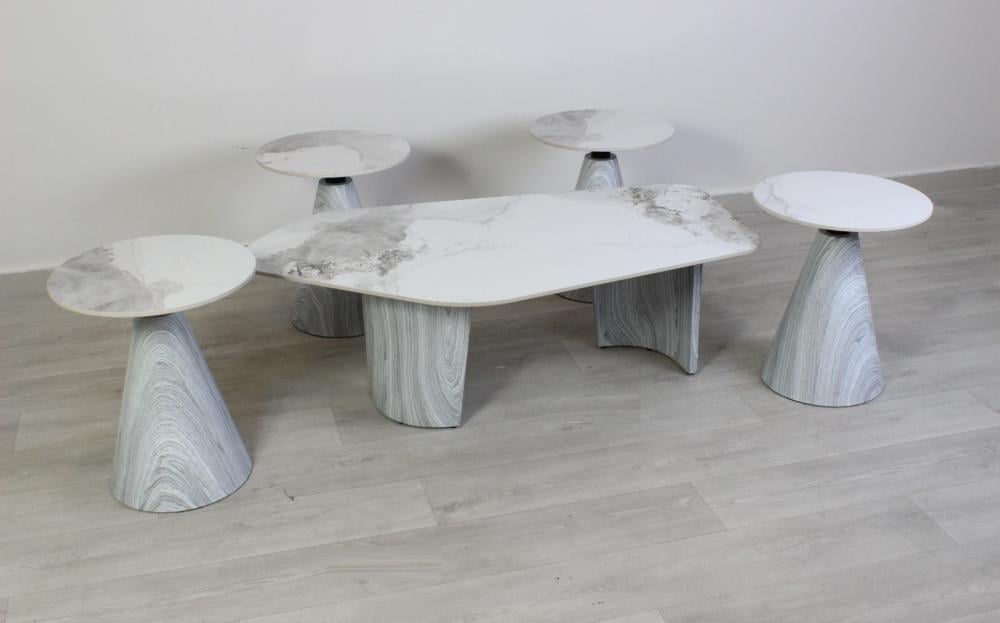 طقم طاولات خدمة يتكون من خمس قطع أنيقة ، مما يضفي لمسة عصرية وجذابة على أي مساحة. يشمل الطقم طاولات بأحجام متنوعة، مما يجعلها مثالية للاستخدام في مختلف المناسبات.