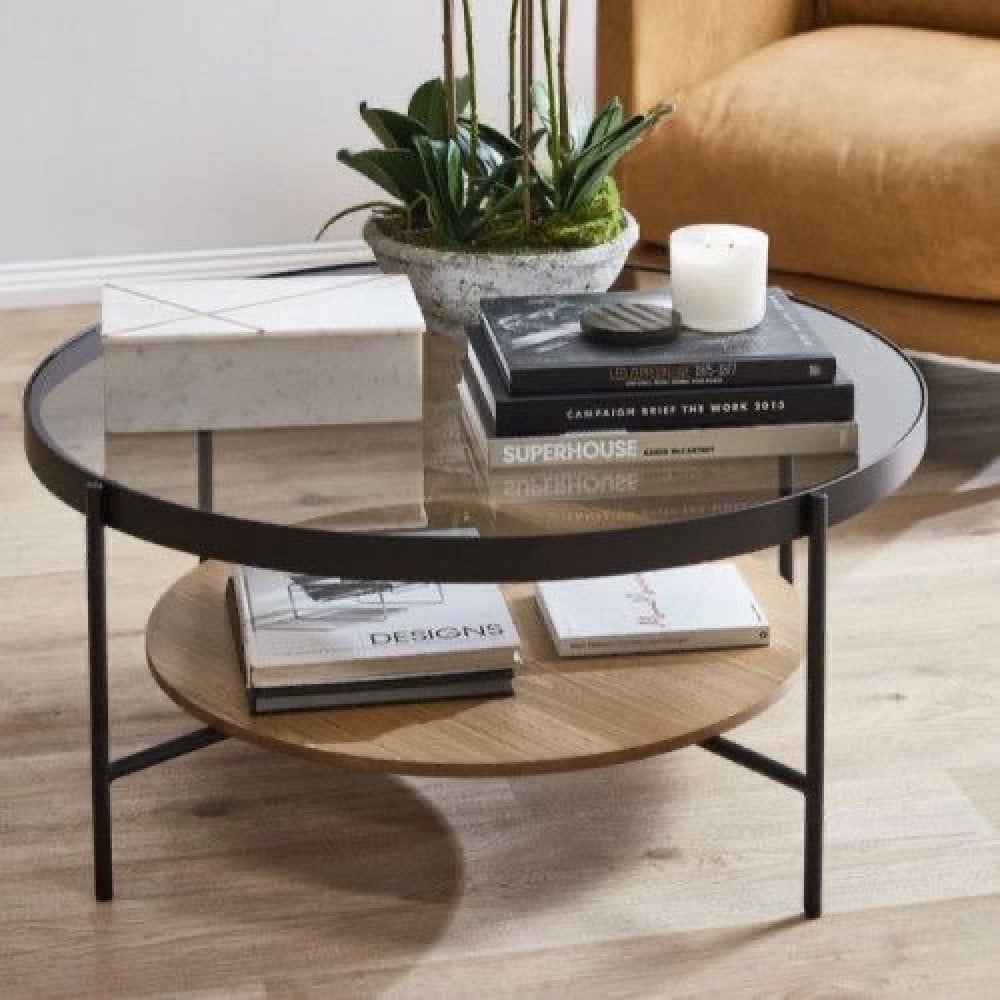 طاولة بتصميم انيق بسطح زجاجي تأتي برف سفلي خشبي، هيكل معدن قوي ومتين، تناسب المساحات الصغيرة و المتوسطة
