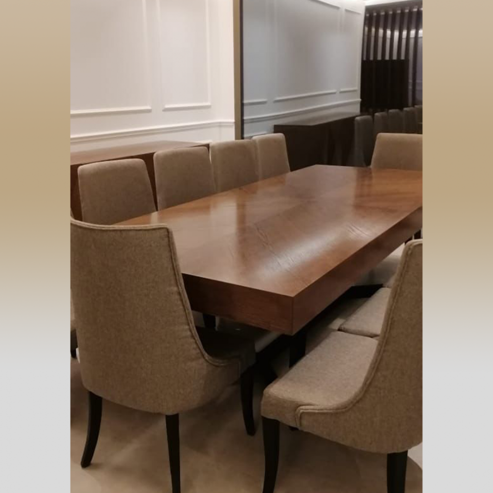 طاولة طعام خشبية أنيقة تأتي مع 10 كراسي مريحة، مثالية للعائلات الكبيرة أو العزائم. تصميمها العصري يناسب أي ديكور داخلي ويوفر مكاناً مريحاً لتناول الطعام مع العائلة والضيوف.