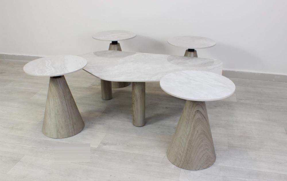 يُعد طقم الطاولات هذا مثالاً للأناقة والتميز بتصميمه الحديث ولمساته العصرية. يأتي الطقم بسطح جذاب وقواعد مخروطية ، مما يضفي جاذبية وتنوعاً بصرياً لأي مساحة.
