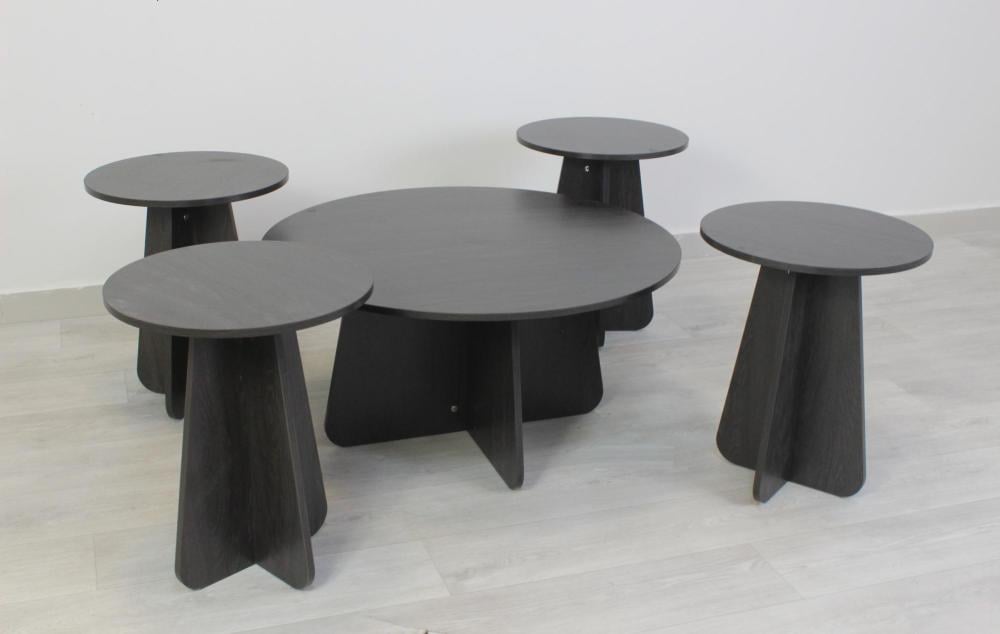 طقم طاولات خدمة يتكون من خمس قطع أنيقة ، مما يضفي لمسة عصرية وجذابة على أي مساحة. يشمل الطقم طاولات بأحجام متنوعة، مما يجعلها مثالية للاستخدام في مختلف المناسبات.