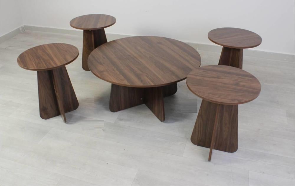 طقم طاولات خدمة يتكون من خمس قطع أنيقة ، مما يضفي لمسة عصرية وجذابة على أي مساحة. يشمل الطقم طاولات بأحجام متنوعة، مما يجعلها مثالية للاستخدام في مختلف المناسبات.