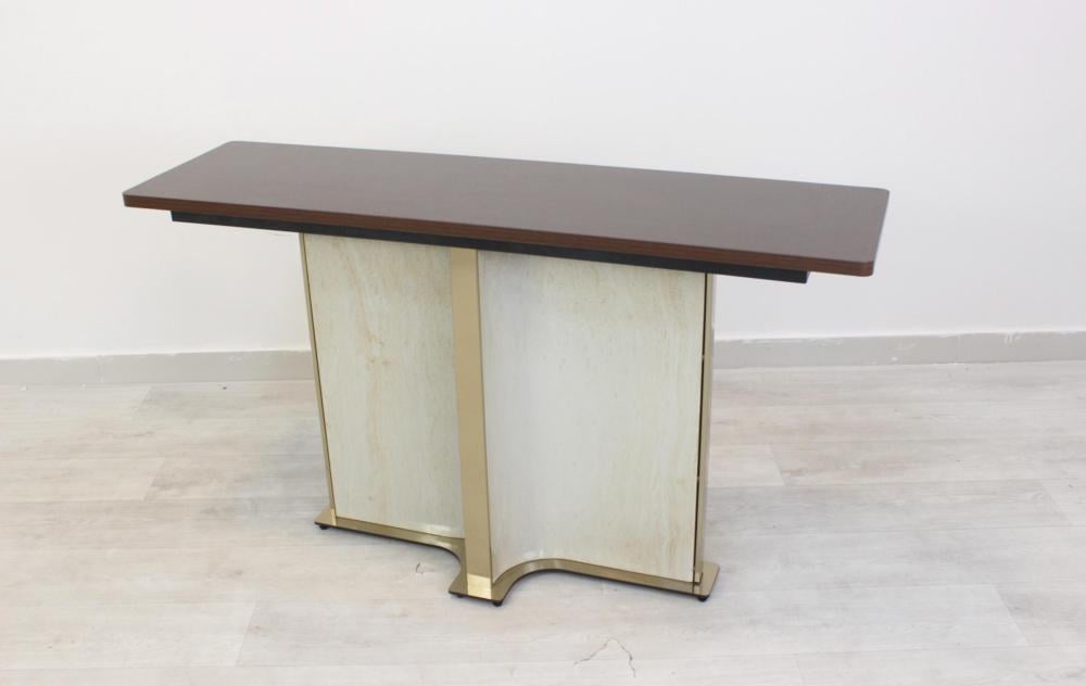 طاولة كونسول بتصميم أنيق وراقي، تأتي بسطح خشبي بني داكن مصقول بشكل مستطيل، مدعوم بقواعد معدنية ذهبية على شكل نصف دائرة مزدوجة، مع قاعدة مغطاة بلمسات من الرخام البيج الفاتح المموج بخطوط طبيعية. هذا التصميم يدمج بين الخشب الداكن والمعدن الذهبي والرخام، ما يمنح الطاولة مظهراً فاخراً ومتميزاً.