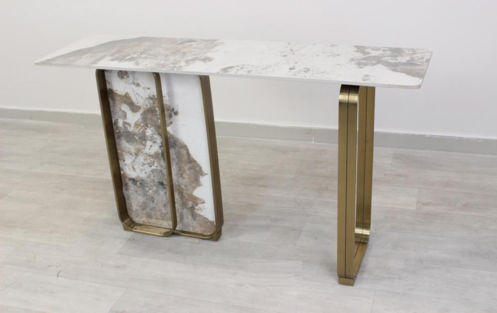 هذا الكونسول يتميز بتصميم عصري وفاخر، حيث يجمع بين سطح رخامي فخم مع أرجل حديدية قوية تضيف له لمسة من الأناقة والصلابة.